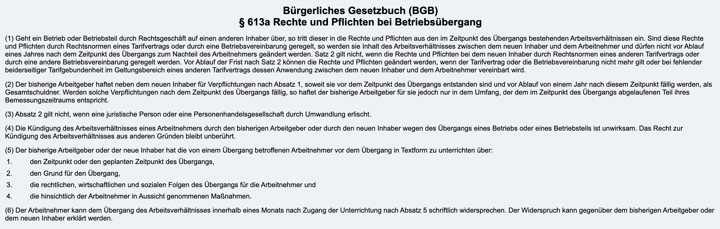 Besonders entscheidend ist dabei der §613a BGB (siehe https://www.gesetze-im-internet.de/bgb/__613a.html). Diese Regelung sorgt dafür, dass viele bestehenden Arbeitsverhältnisse automatisch auf den neuen Inhaber übergehen. So ist sichergestellt, dass die Mitarbeiter nicht plötzlich ihren Chef, ihren Arbeitsvertrag und alle alten Zusagen verlieren. Der Schutzgedanke steht klar im Vordergrund, aber natürlich gibt es Ausnahmen und Sonderfälle. Dazu komme ich gleich.